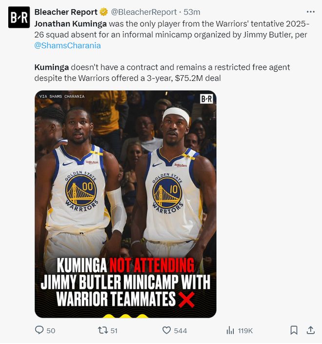 巴特勒組織迷你訓(xùn)練營:庫明加成勇士唯一缺席者 經(jīng)紀(jì)人強(qiáng)調(diào)訴求