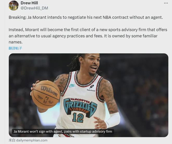 據(jù)灰熊記者Drew Hill報道,莫蘭特打算在沒有經(jīng)紀人的情況下,和灰熊續(xù)約談判。莫蘭特現(xiàn)有合同5年1.97億美元,2028年夏天到期,未來三年薪水分別是:3945萬、4217萬和4489萬美元。目前